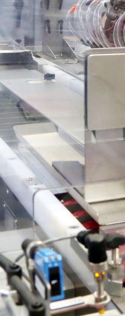 As Propack owner and president Chris Follows explains: “We take freshly made product from one line and distribute product to two wrapping legs. Each wrapping leg receives a row of product, meters, and then turns the bars from long-side leading to shortside leading. There’s then an electronic inspection of the bars to ensure dimensional accuracy.