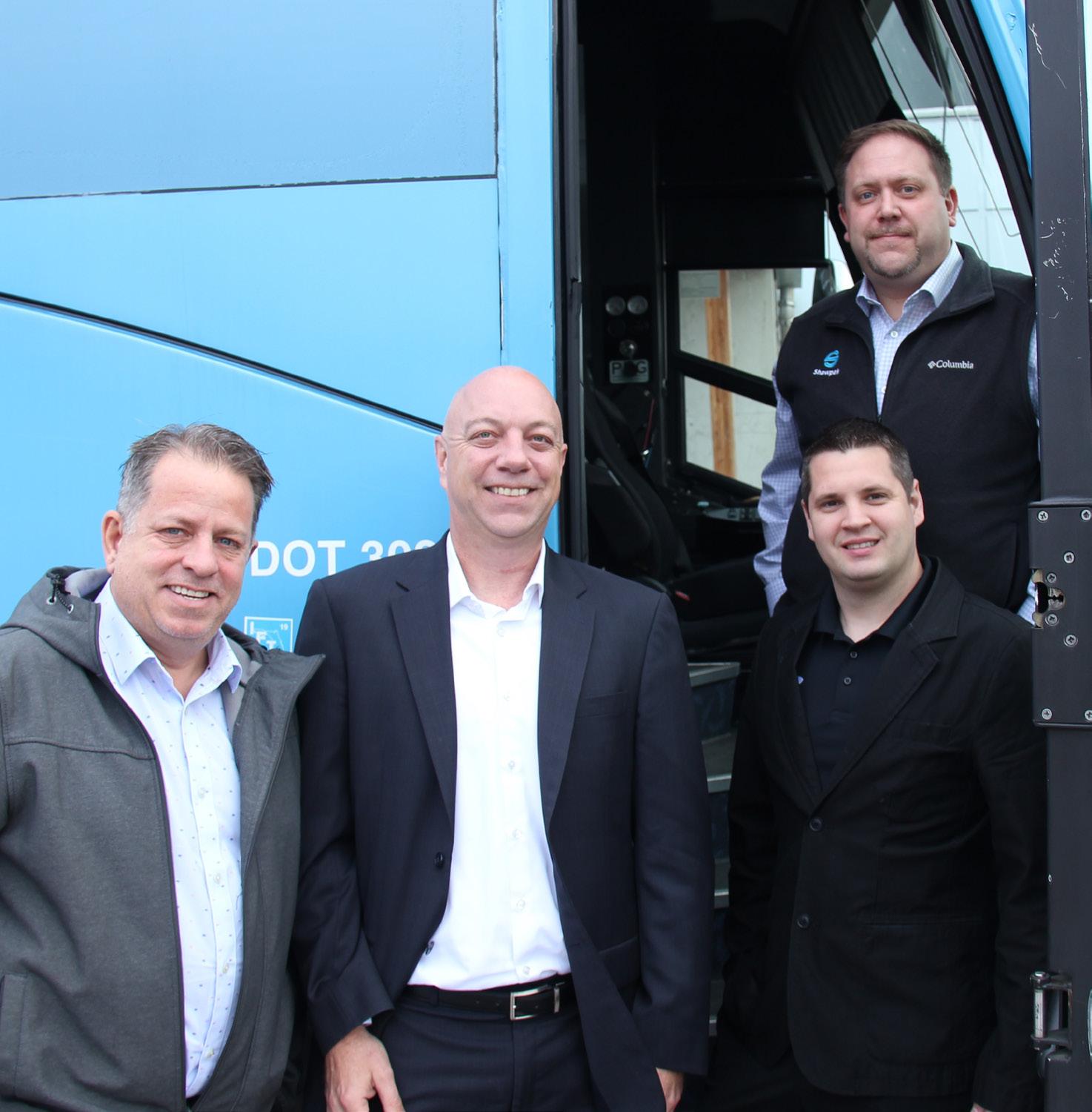 Left to Right: Tonejet sales manager Marvin Foreman and chief executive officer Rob Day poase alongside Solucan president Sebastien Baril and general JeanFrancois Gaudreault in front of the Cyclone digital printing system.