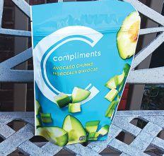 The frozen Compliments Plus Avocado Cubes in a resealable stand-up pouch.