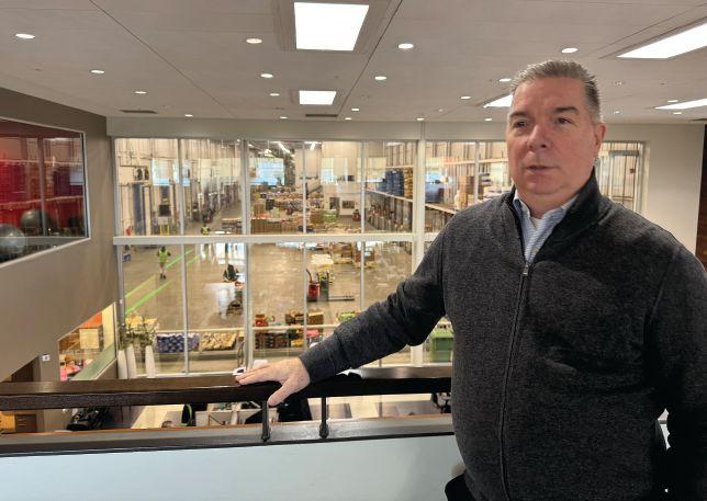 FANUC America’s president Michael Cicco strikes a pose in front of multiple rows of the company’s heavy-duty, high-payload robots stocked at FANUC Canada’s new headquarters facility in Mississauga, Ont.
