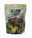 The California-based Fresh Gourmet Company does this trick convincingly with the zippered stand-up pouches of Fresh Gourmet Organic Seasoned Premium Croutons —using large-sized, allcaps lettering to full effect to trumpet the product’s “ORGANIC/BIOLOGIQUES” credentials before the shopper’s eyes move elsewhere on the package. The green lettering outlined in black against the white background, with the brand logo outlined in a subtler shade of green, makes for one very compelling organic declaration, with the appetizing ‘good-enough-to-eat’ salad graphics with large, perfectlytoasted croutons proving once again that a good picture really is “worth a thousand words.”