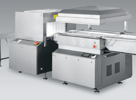After passing through an Urschel Translicer, the pre-cut product enters the Model 450 automated inspection system manufactured by Raytec Vision S.p.A ., which thoroughly checks the product for foreign materials and any defects in