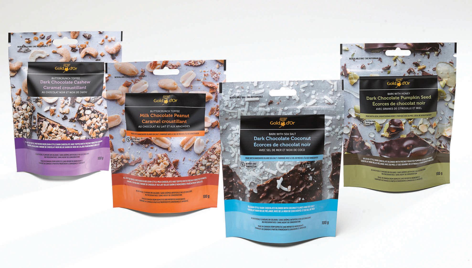 Offering one-year shelf-life, the new chocolate bark treats are packaged in resealable, recyclable, matte-finished stand-up pouches decorated with vivid graphics and product images designed by the Montreal office of leading package design services provider Pigeon Brands