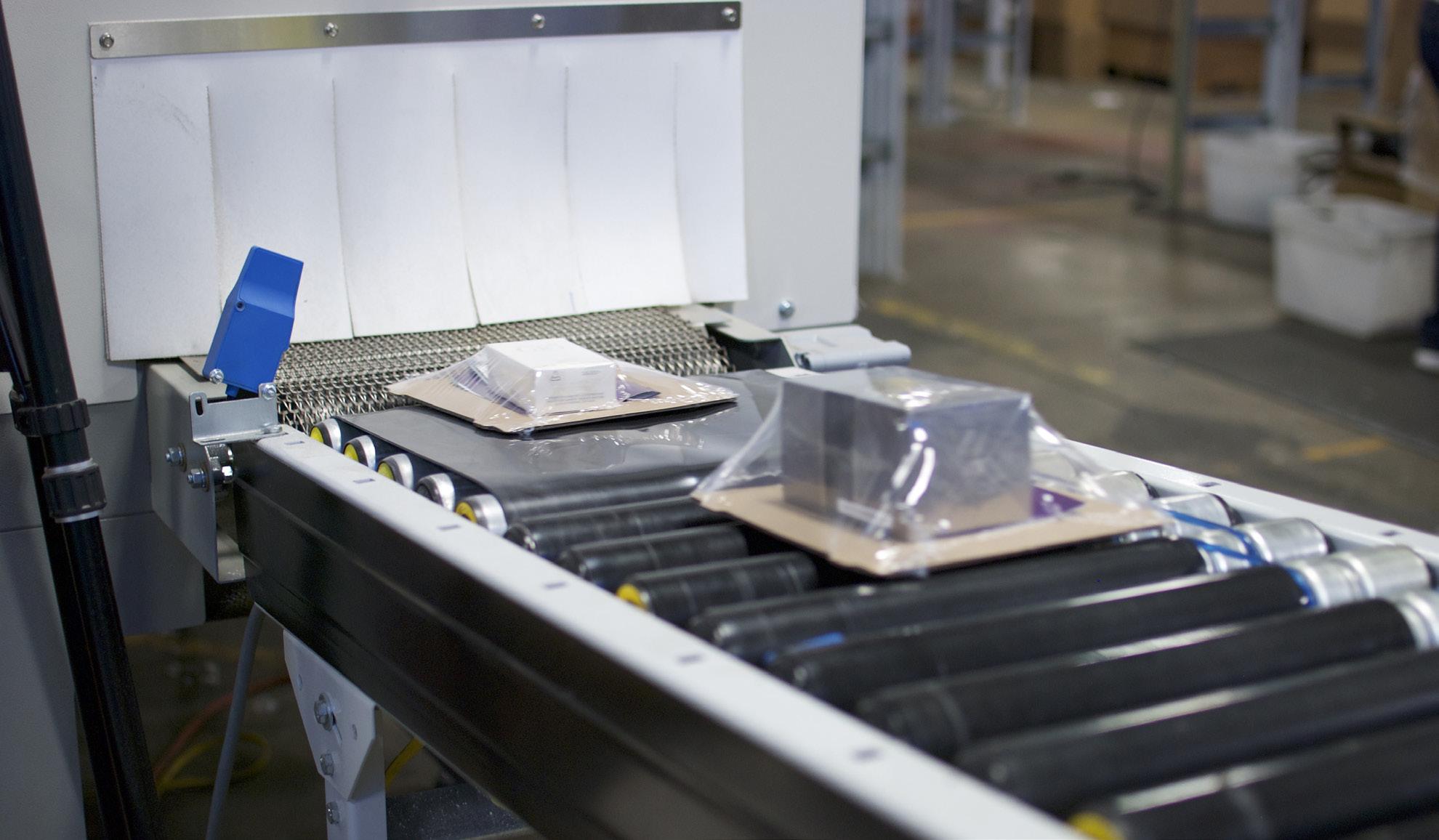 The pad is then conveyed through the shrink wrap heat tunnel and the box is formed around it using the ParcelPack equipment. The shipping label is printed and applied automatically to adhere to the top of the box, and the order and the shipping label are verified that they match.