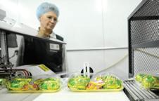 After moving past a Label Systems LS-100 that places a product label atop the film, a MarkemImaje Markem 9064 inkjet coder applies lot data onto the label, before the trays are hand-packed into corrugated cases manufactured by Royal Container Ltd.