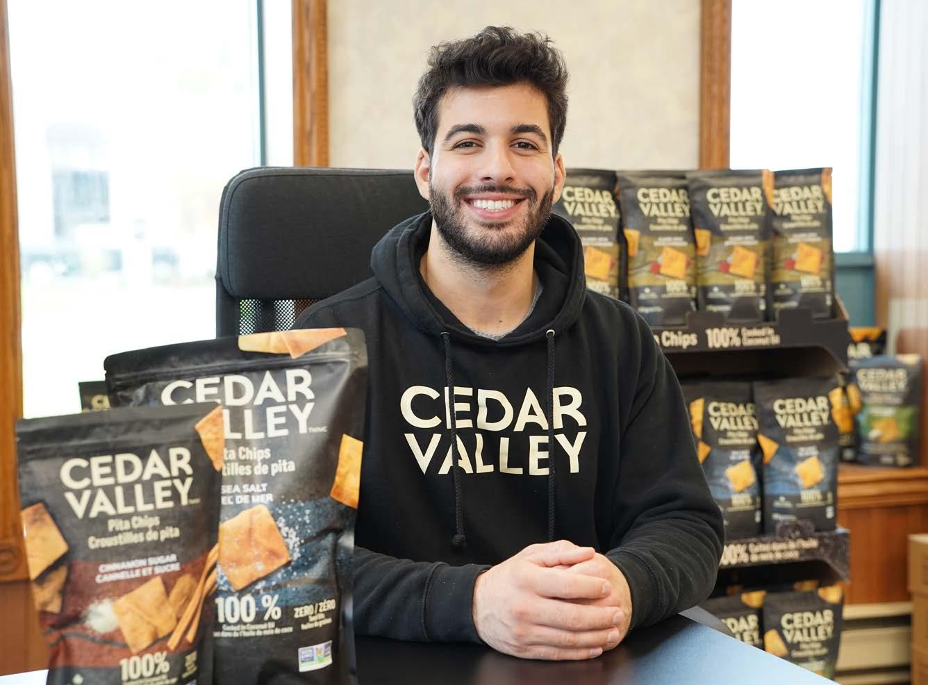 Ameen Fadel and Surria Fadel strike a cheerful pose alongside a corrugated merchandising display filled with family-size stand-up pouches of their company’s flagship brand pita chips. Cover photo by Ahmad Sayed.