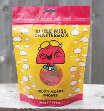 Little Miss Chatterbox is one of many famous characters in all of children’s literature. The book belongs to the Little Miss book series which started in 1981. Prior to every little girl on the planet wanting to be a Little Miss, there was the Mr. Men series which launched ten years earlier. Today, these Mr. and Miss characters can be found in all kinds of popular culture, including television series, comic books, video games, board games, toys, candy and more. One of the more recent products to spawn from the Little Miss collection is Fruity Gummies. The packaging on the gummies stands out due to their spectacular use of color and boldly drawn illustrations which illuminate Little Miss Chatterbox on her mobile phone. The phone-shaped candy is a clever concept because of the character’s talkative personality. The gummies are packed in a glossy, plastic, flexible, resealable flexible pouch for easy opening, dispensing and storage.