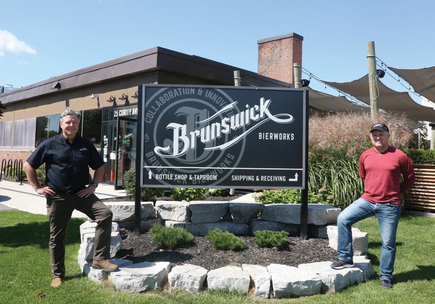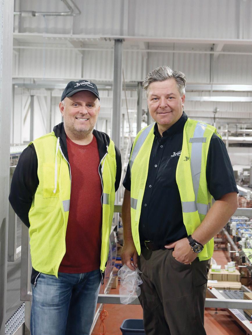 Brunswick Bierworks president Sean Fleming and chief operating officer Christoph Von der Heide strike a cheerful pose from top of the stairs leading to the mezzanine level of the company’s newly built production facility housing a turnkey state-of-theart Krones canning line. Cover photography by Naomi Hiltz.