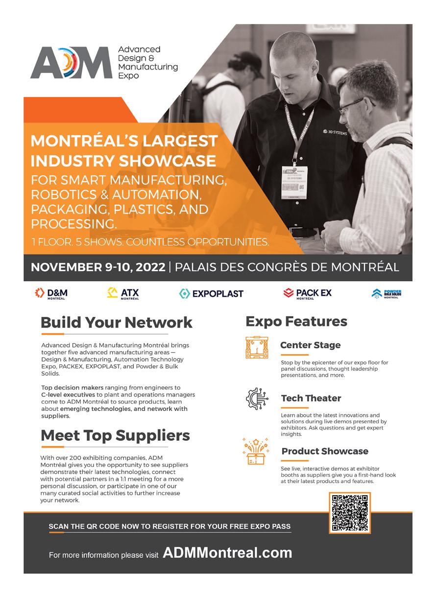 Montreal: ADM (Advanced Design & Manufacturing Expo) Montréal Cross-industry exhibition comprising PACKEX , ATX , Design & Manufacturing , Expoplast , and Powder & Bulk Solids. All at the Palais des congrès de Montréal.To register, go to: www.admmontreal.com