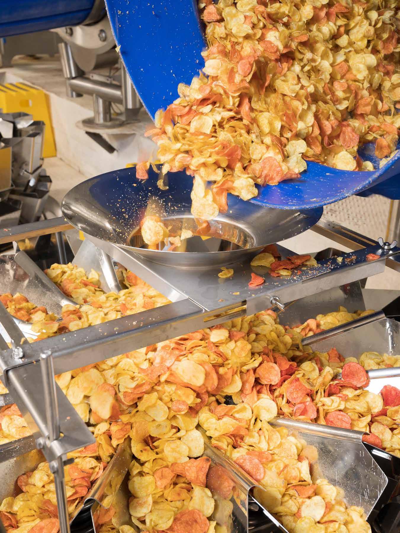 Thick crunchy slices of freshly kettle-cooked all-natural Hardbite brand potato chips filling up the high-precision Ishida multihead scales with bulk product at the start of a packaging run at the new Naturally Homegrown Foods production plant in Surrey, B.C.