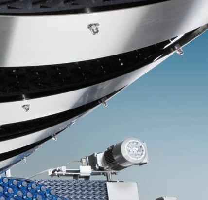 The ideal solution is a spiral conveyor. It takes the concept of an incline conveyor but configures it in a helix. This allows the same elevation change as an incline conveyor, but with a fraction of the footprint. Another advantage is that depending on the size and stability of the product being conveyed, the angle of incline can be lowered without increasing the footprint of the machine.