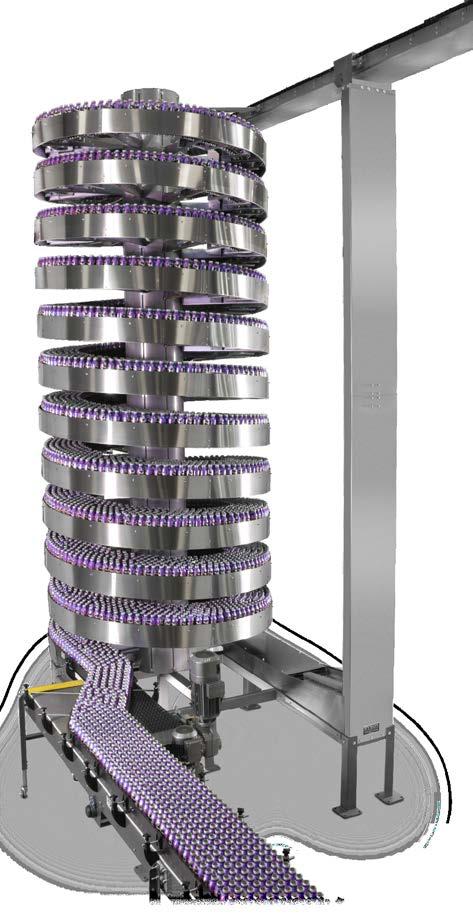 Spirals can also be configured to provide vertical accumulation allowing beverage companies to create buffers or accumulation zones utilizing vertical space. This feature is particularly useful in situations where downstream processes may experience temporary interruptions, such as equipment maintenance or changeovers. By accumulating products vertically, beverage companies can maintain a continuous flow of materials, prevent disruptions, and minimizing costly down-time.