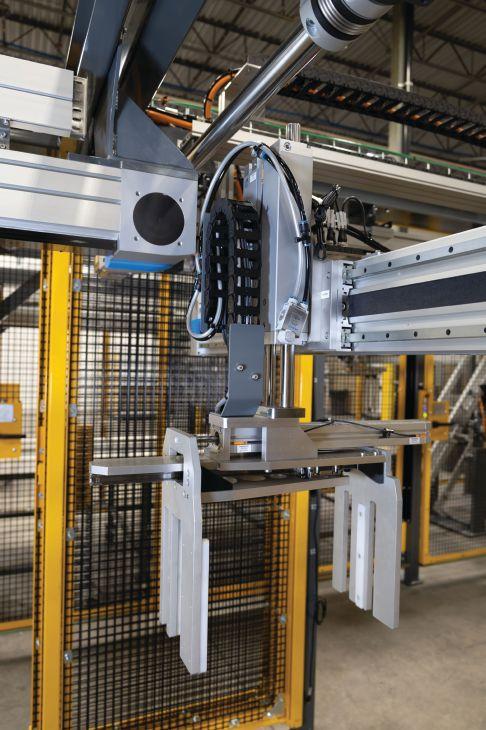 Rather than bing picked-and-placde by a robot, the gantries slide the bundles through to the rotator, which provides better control, says Graham. (So far, the customer has ordered three such cells, and negotiations are under way for additional units.)