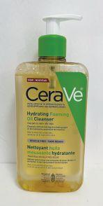 The CeraVe Hydrating Foaming Oil Clenaser in 355-mll clear plastic bottle with an easy-lock pump.