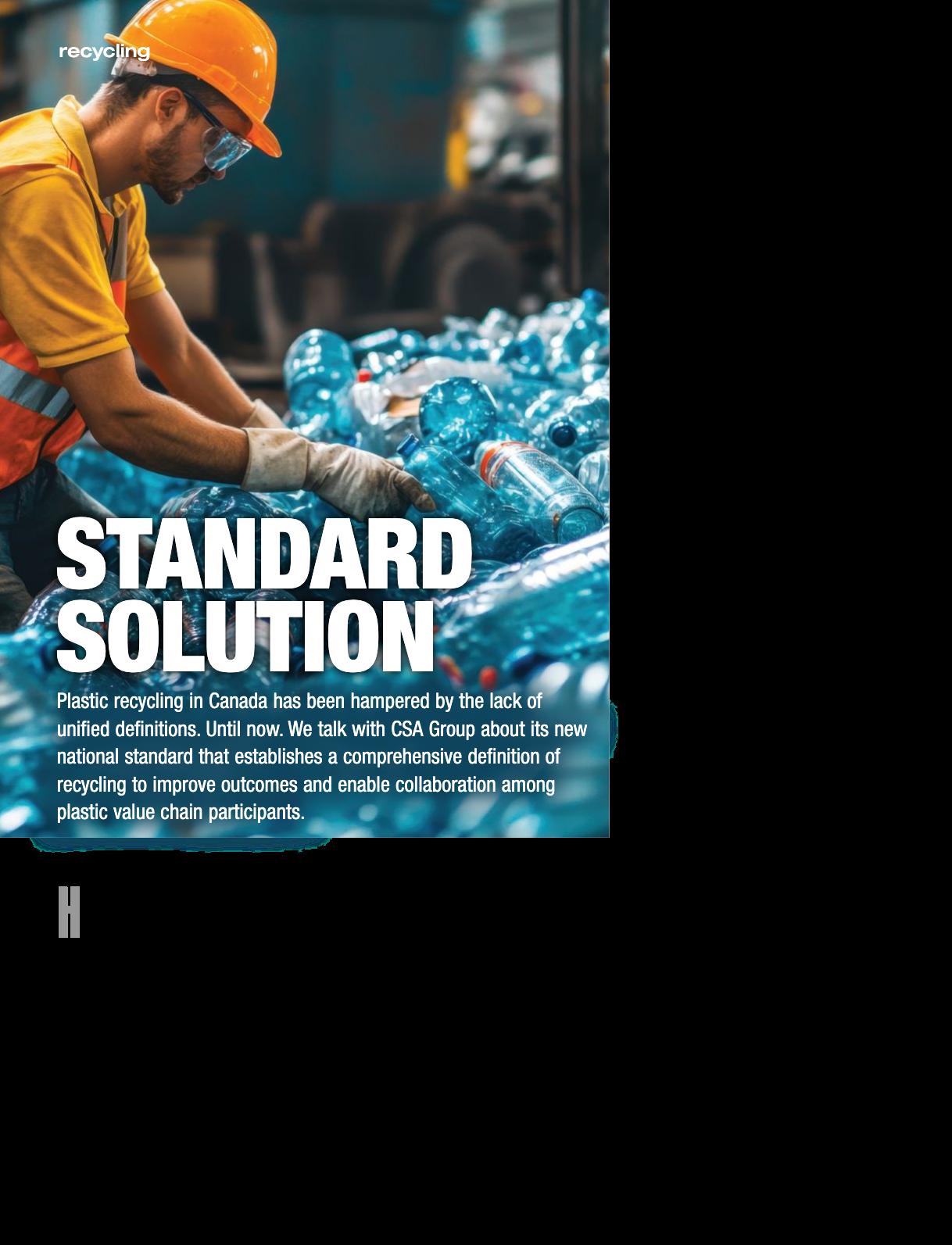 The circular economy is a major focus at CSA Group. I’ll note that the new standard doesn’t create a circular economy, but by providing a com mon and consistent definition it plays a pivotal role in facilitating the transition towards that circular economy We need a clear, standardized approach to measuring and understanding plastic recycling to enable the set ti ng of more accu rate, d at a- d r iven