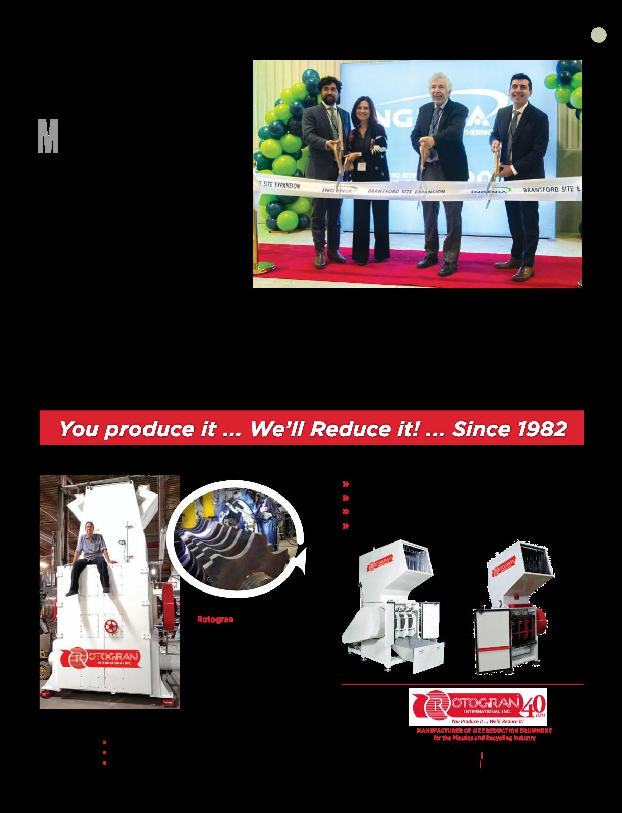 “Customers have become more soph isticated about size reduction over the past 10 to 15 years, more aware of the value of reusing off-spec par ts and other production waste, and much more system-oriented,” said Mike Cyr, president of Rotogran Inter national. “Instead of buying just a granulator, they now want a complete package: a control panel with extra safety features, a conveyor to feed the granulator, a metal detector, an evacuation system at the back end, a fine separator system, a dual Gaylord stand with scales under neath to measure how much material is going into the box, and as much automation as possible ” And customization is also impor tant to them, Cyr continued. “They’re not satisfied any more with having to ma ke a standard granulator fit into their space,” he said “Now they want the granulator sized to fit the space they’ve allocated for it, and it’s up to the OEM to ma ke that happen by customizing the hopper, cutting chamber, and other par ts of the unit ”