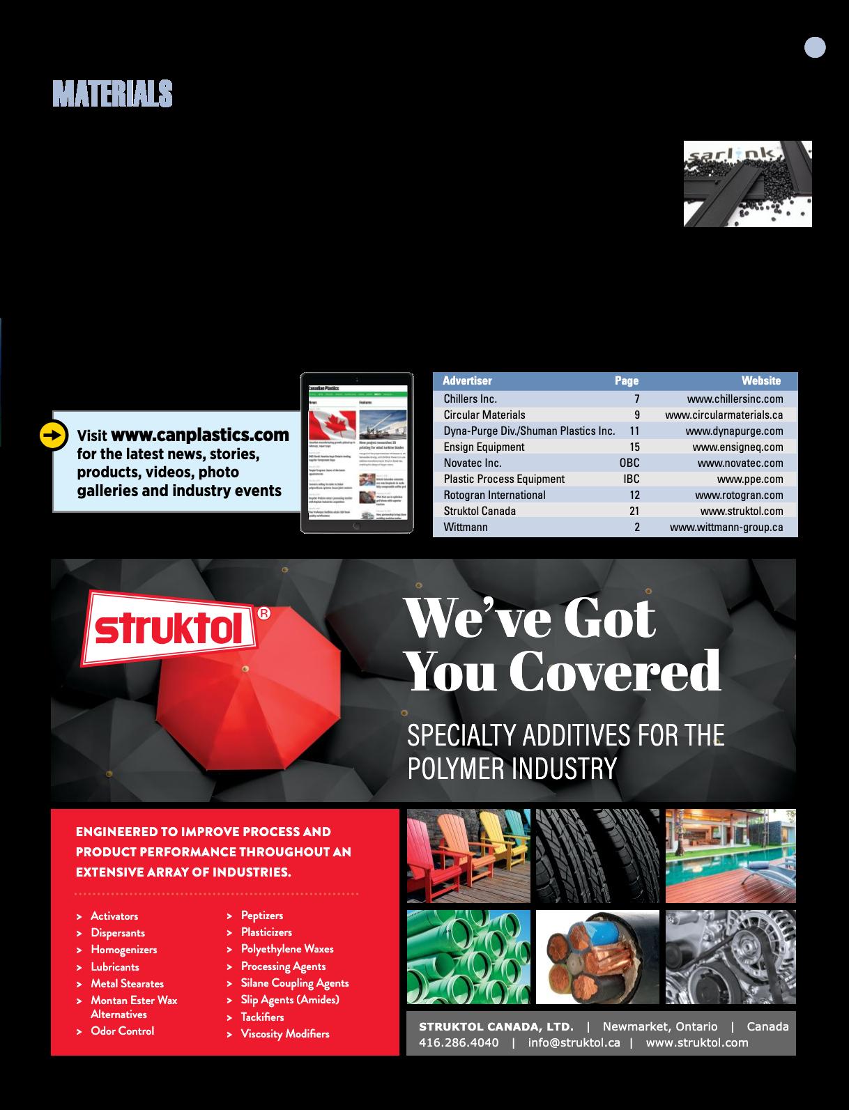 CPCs can be used for a wide ar ray of extr usion processes – pipe, profile, tubing, sheet, film, compounding, and extr usion blow molding – and there are some things to consider in order to choose the best product for your system, beginning with the ageold strategy of purging with either production resin or regrind In the right situations, some CPC suppliers say, both can work, with perhaps the best-case scenario being pipe extr uders r unning dedicated lines without colour or material changes. “Since these machines have bigger orifices and bigger and less intricate dies