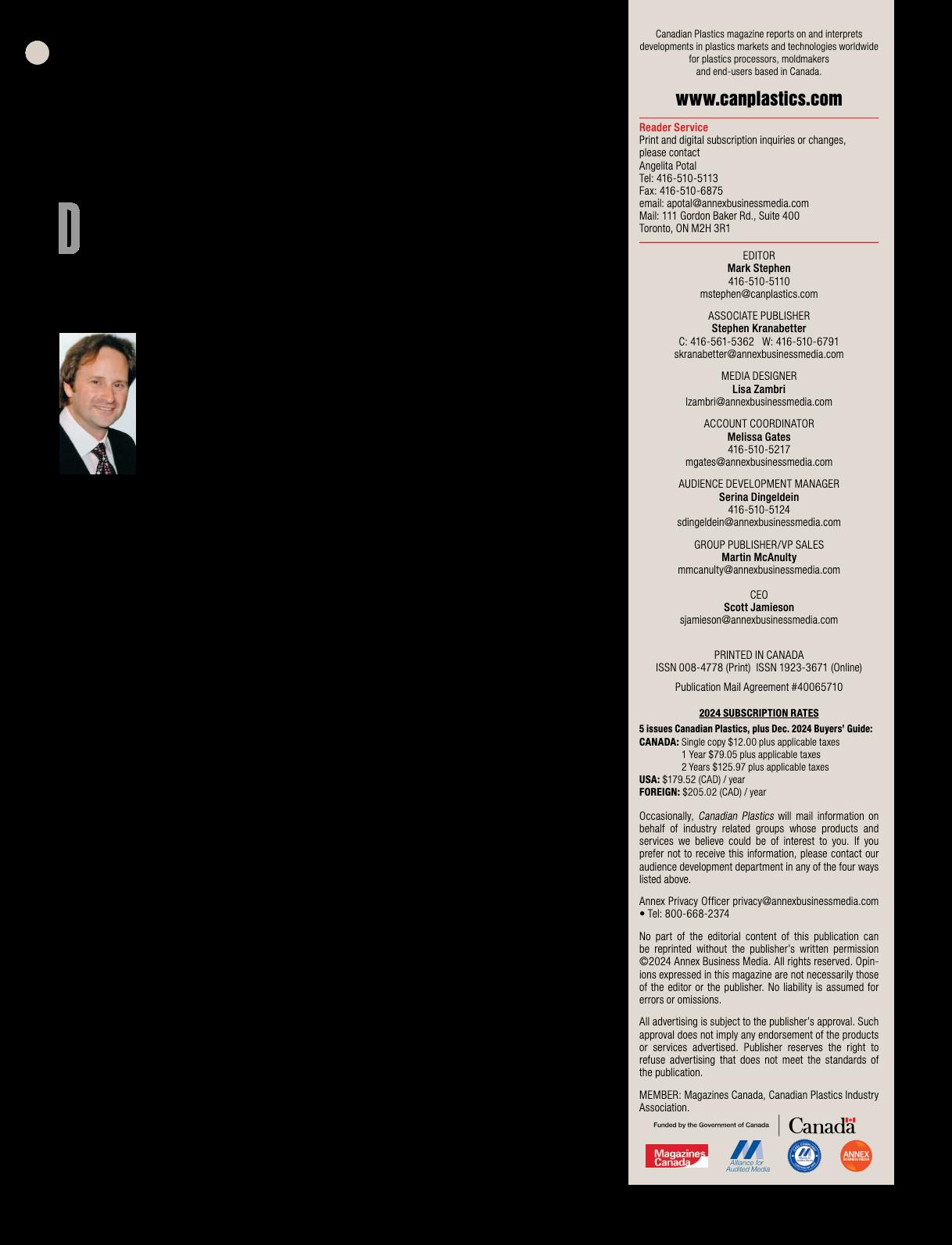 T he rea son why isn’t ha rd to u nder st a nd: St a h le def i n it ely k nows what he’s t a l k i ng ab out. “I’ve b e en i n t he i ndust r y professiona l ly si nc e 1986, wit h t he major it y of t hat t i me sel li ng t her mopla st ic resi ns,” he sa id “My b eg i n n i ngs go back f u r t her, to work i ng at my fa m i ly’s custom mold i ng shop i n K it chener, O nt , st a r t i ng when I wa s 15 My work exp er ienc e i ncludes ha nds- on mold i ng, mat er ia ls ha nd l i ng, ma nagement of pro duct ion, pu rcha si ng, i n for mat ion t e ch nolog y, customer ser vic e, a nd sa les a nd ma rket i ng.” A f t er a ca re er t hat i nclude d a 12-yea r sa les p osit ion wit h A Schu l ma n Ca nad a, St a h le