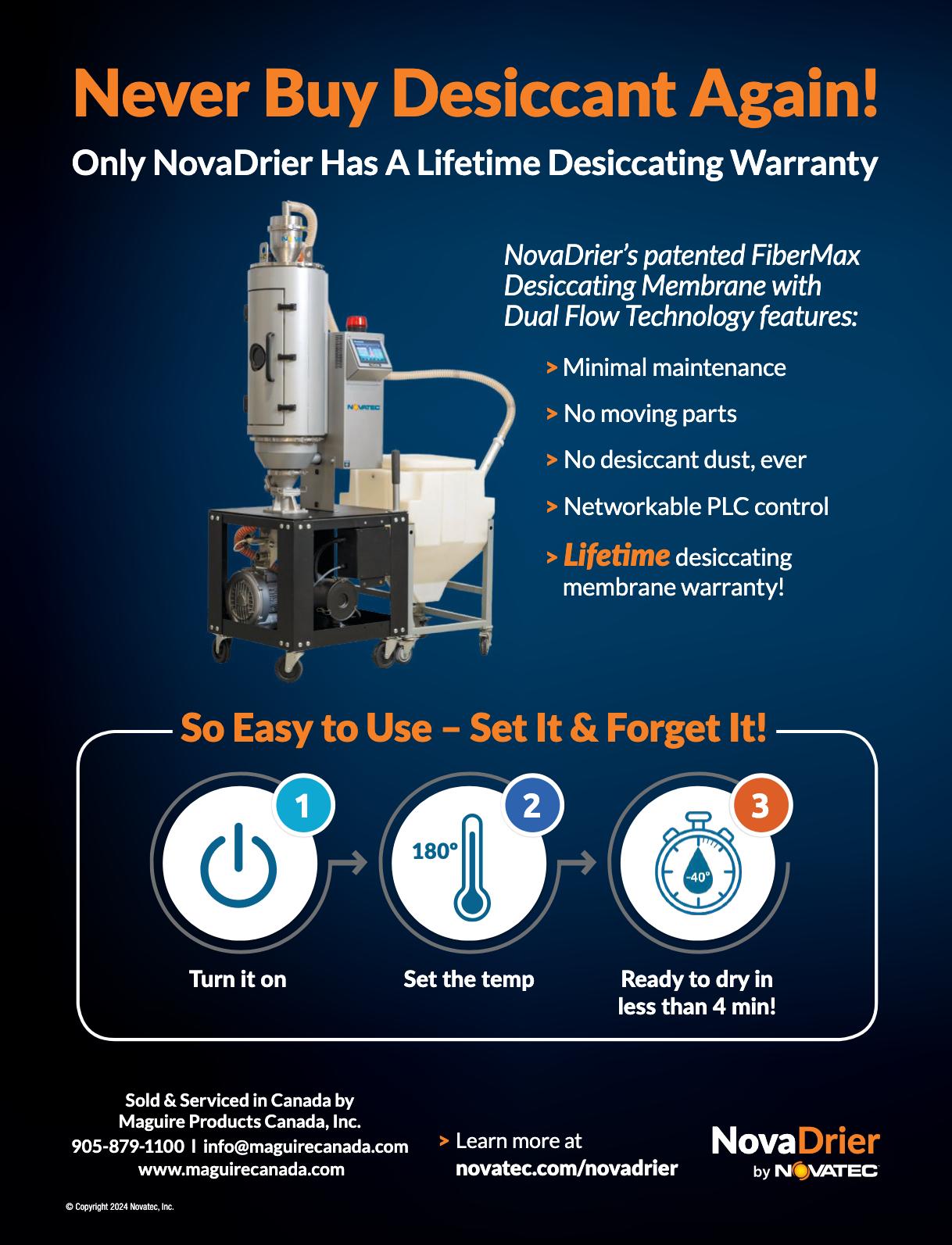 environment, and documents all process data. With the help of this function, Motan officials said, the user achieves continuous self-optimization of the system and consequently the best possible operating point with the highest recipe accuracy and consistent product quality And than ks to event-ba s e d log g i ng, a l l pa r a m et e r changes are stored in a control repor t and can be subsequently evaluated Novatec int roduced a new conveying tech nology that a ims to give processors more power, f lexibilit y, a nd f inesse to convey mat er ia ls wit hout t he ne e d to oversize the system. Ca lled the I n f in ity vacuum pump, Novatec off icia ls sa id the pat ent-p end i ng t e ch nolog y t r a nsc end s t r a d it io n a l va r i a ble -f r e q u e n cy d r ive induction motor tech nology – wh ich has long been the sta nda rd in the indust r y –a nd instead incor porates adva nced in novat ions i nspi re d by t he pre cision a nd eff iciency of elect r ic veh icle ( EV) technology. At the core of the I n f in ity ser ies is t he I n f i n it yD r ive m ag net ic mot or, wh ich doesn’t use the t raditiona l belts a nd she aves t hat of t en c ont r ibut e t o ma intena nce a nd operationa l ineff iciencies I nstead, it uses Novatec’s own I PMSyn R M motors or igina lly conceived to power EVs eff iciently to ach ieve a n operationa l ra nge that extends f rom 35 to 150 per cent of rated capacity T he I n f inity ser ies a lso includes a cr itica l feat u re t hat Novat e c dubs “Lud ic rous mo de,” wh ich automatica lly detects blockages in the conveying lines a nd delivers a shor t, cont rolled bu rst of power at 150 per cent capacit y to clea r the obst r uction, ensu r-
