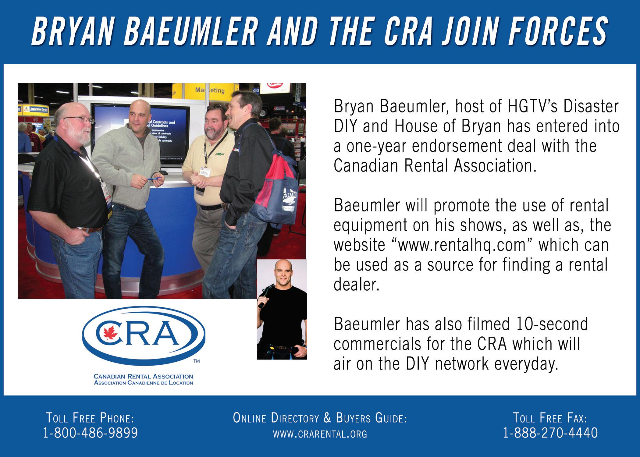 our ceux qui se sont rendus au Rental Show de Las Vegas, j’espère que vous avez bien profité de la belle température, des séminaires, du Salon ainsi que les rencontres avec les propriétaires et employés de divers centres de location de partout à travers le pays – et peut-être même d’ailleurs au monde, puisque 30 différents pays sont représentés au Rental Show de l’ARA. J’espère que vous avez profité des aubaines offertes par l’Association Canadienne de Location pour vos chambres d’hôtel. Il y en a parmi vous qui auront été chanceux avec les machines à sous, mais la plupart d’entre nous, je crois, avons perdu plus que nous n’avons gagné. C’était plus facile pour moi de recevoir une ristourne de ma compagnie d’assurance, HED Assurance et Gestion de Risque. Ils ont annoncé lors de la réunion annuelle des membres, que les chèques pour les centres assurés par HED avaient été postés pour la seconde année consécutive. En calculant bien, cela fait plus de 1 000 000.00$ en ristourne qui a été payé aux membres en deux ans seulement! Non seulement la police d’assurance est excellente, mais elle nous offre une stabilité sur nos primes, créé une source de revenue pour l’Association, et remet l’argent à ses membres lorsqu’il y a un surplus. Présentement, nous avons environ 60 pourcent de nos membres qui sont assurés par la compagnie HED Assurance et Gestion de Risque. Nous travaillerons de plus près avec eux pour promouvoir leurs services et bénéfices à nos membres. Nous avons aussi présenté Bryan Baeumler aux membres qui étaient présent lors de la réunion annuelle des membres et au kiosque de la CRA pendant le Rental Show à Las Vegas. Il est notre nouvel ambassadeur pour les campagnes publicitaires de HGTV. Si vous ne le connaissez pas encore, prenez le temps de regarder ses émissions quand vous en aurez la chance. Il promeut la location des outils et dirige les clients au site web d’annuaire de centres de location membres de l’ARA, www.RentalHQ.com. Ce projet est d’une importante envergure pour nous au niveau budgétaire, et nous le surveillons de près. Il y aura aussi des publicités qui seront diffusées à travers l’année sur la chaîne HGTV avec toujours les mêmes messages de Bryan, encourageant les gens à louer leur équipement plutôt que d’acheter. Faites un tour sur www.RentalHQ.com et trouvez votre centre de location. Vous voudrez faire certain que votre information soit bien mise à jour, que votre site web soit bien visible, et que les clients soient incités à naviguer sur votre page web, sinon un client potentiel ira faire un tour chez vos compétiteurs!
