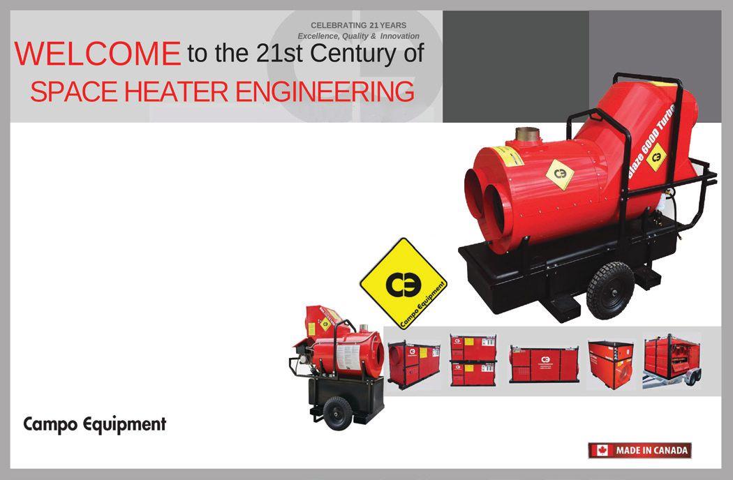Campo Equipment has introduced its new directfired heater, complementing its electric and indirect fired heater line up. The DF-650 from Campo Equipment is a direct-fired, 650,000-BTU heater that delivers 5,500 CFM with four inches of static pressure. With a standard quick-change valve, the DF-650 runs on natural gas or propane. Ductable to 100 feet, the DF650 does not require expensive rigid metal ducting like other heaters.