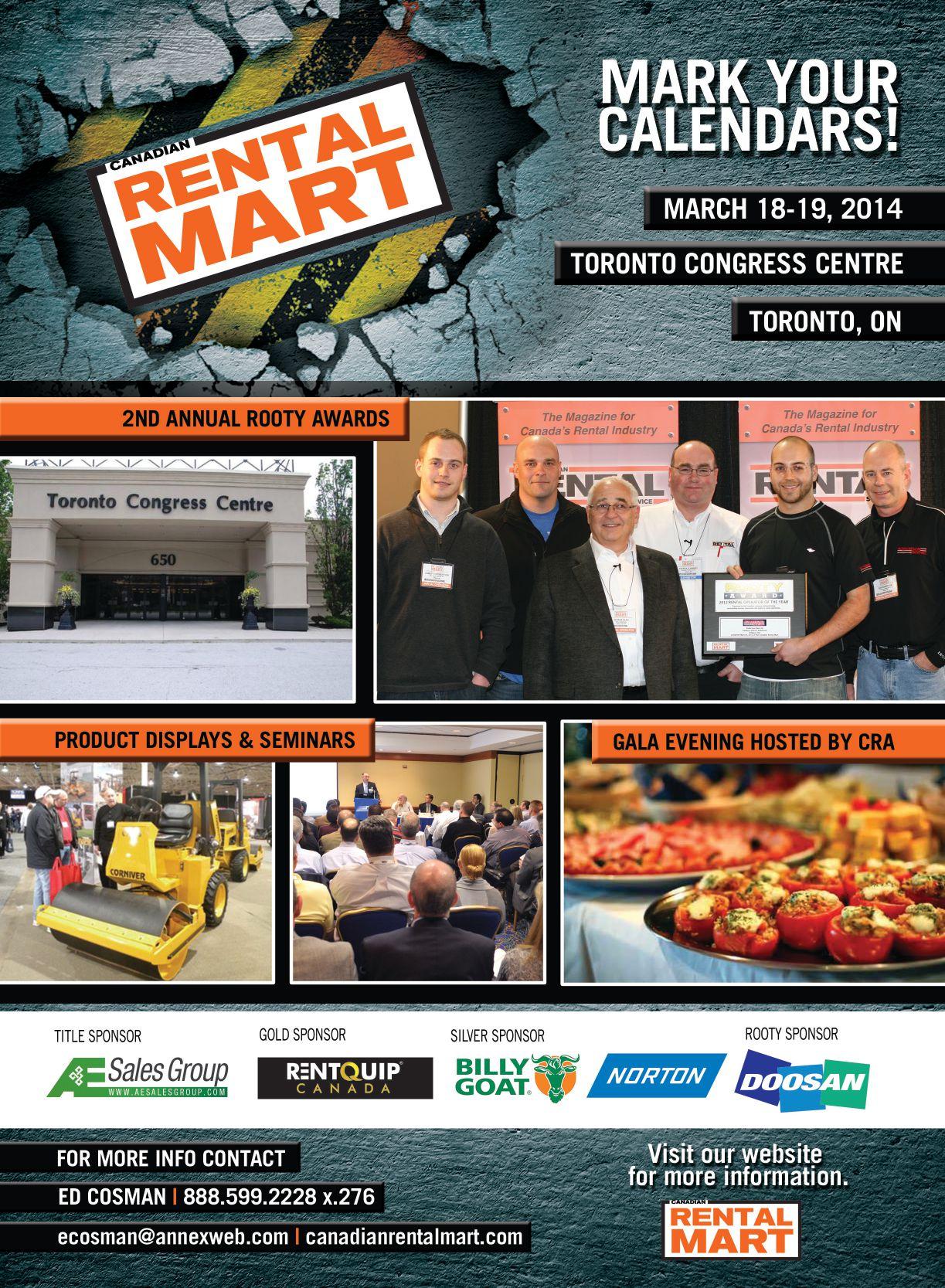 You can find all the information you need about Canada’s national rental trade show at canadianrentalmart.com. Online registration and hotel booking is just a click away. Video previews from exhibitors will help you plan your visit. Follow @TheRentalMart on Twitter for up-to-the-minute updates on show news. And join the conversation on Facebook at facebook.com/CanadianRentalMart.