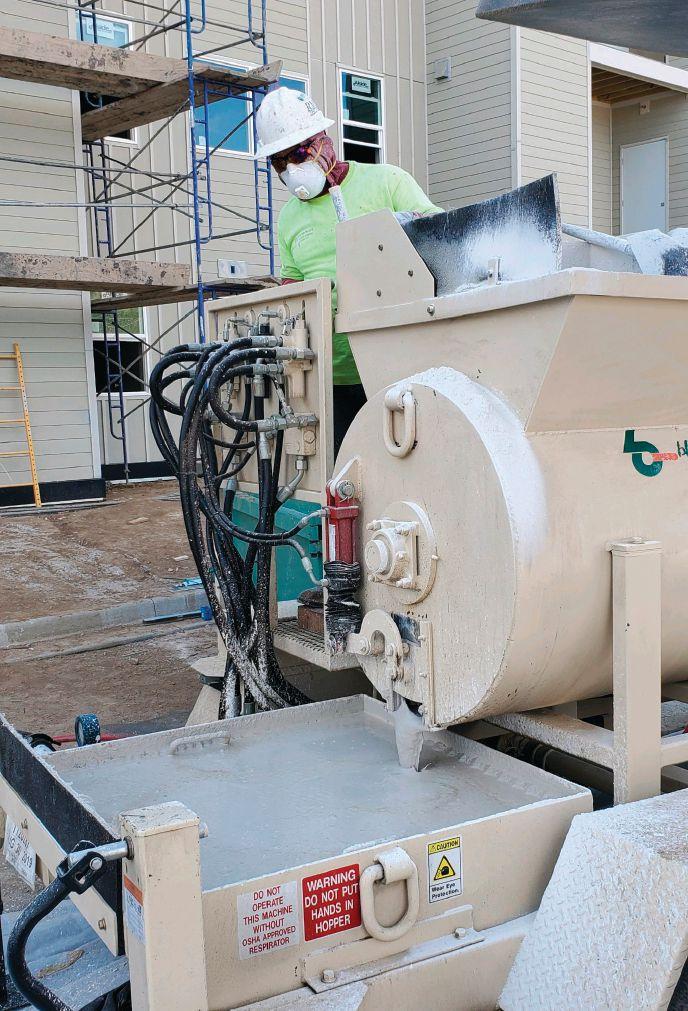 The time is now for gypsum concrete as improvements have been made to its formulation over the last 15 years or so. Gypsum concrete used to have a reputa tion as being soft and chalky compared to regular concrete. That just isn’t true any more. Newer formulations can actu ally have a higher compressive strength than concrete, even up to 10,000 psi. It’s also a binder that can be mixed with var ious sands and aggregates to create appli cation-specific surfaces. That’s where mixers and pumps come in.