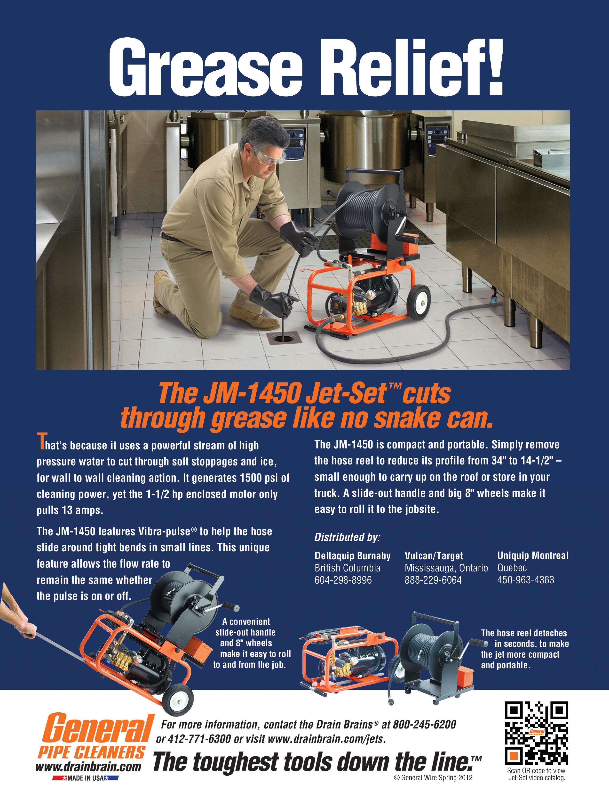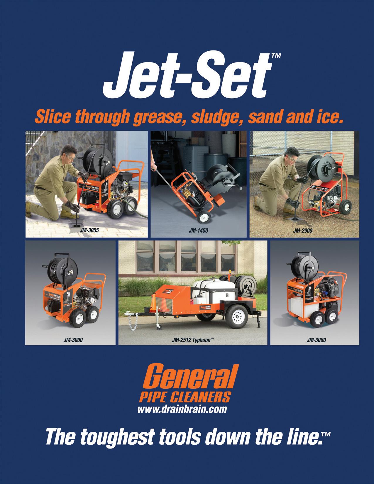 General Pipe Cleaners has completely redesigned their line of Jet-Set™ water jets to offer more power, portability, and ease of use. Water jets clear soft stoppages and ice with a stream of highpressure water that gives you wall-to-wall cleaning action. Ranging from the JM-1450 compact electric jet, to the JM-2512 Typhoon™ trailer jet, General has a jet for you.