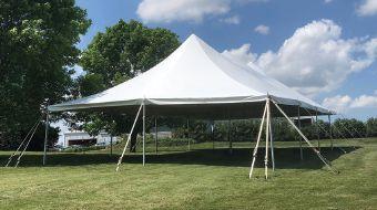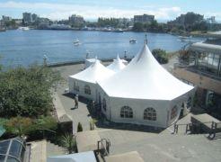 conditions. Available in 12 sizes, 100- to 1,380-squarefoot marquees can be linked together in many configurations and can also be joined with Peak Pole tents. The smooth graceful lines conceal a rental-tough, durable, simple frame. The multiple size options streamline rental inventory. The unique gutter system allows the tents to be joined in a variety of configurations. A flying centre pole supported by diagonal cables gives an obstruction-free spacious interior. Baton sliding walls slide and attach neatly to the post for an open side setup. The batons make carrying and installing the walls quick and easy while reducing wear, tear and cleaning. The canopy is double-curved for beauty and wind stability. Peak Marquee tents are fire retardant, satisfying ULC-S109 for the National Building Code and also NFPA 701 Large Scale per the California Fire Marshal. They are also mildew- and rot-resistant, constructed of 18-ounce vinyl polyester with a gloss self-cleaning finish in a variety of colours including white and opaque with a colour-coordinated top pennant. They come in a protective fabric cover bag with convenient handles for carrying. The walls are fire retardant, 14-ounce vinyl/ polyester fabric. Options include sliding with batons or standard; plain, mesh, clear vinyl, bay or french windows; and zipper or framed doors.