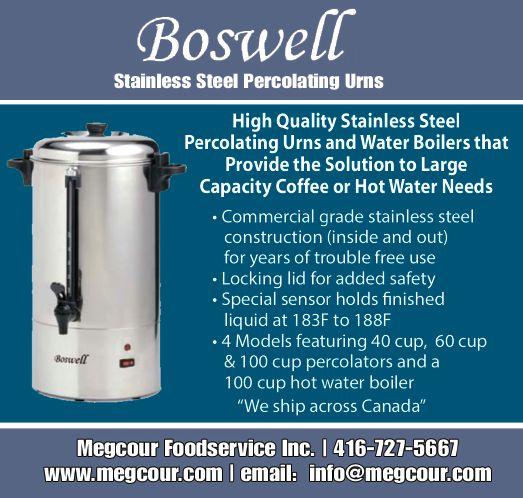 Boswell coffee urns from Megcour Foodservice in Mississauga, Ont., are dependable products designed and built to the highest industry standards. Megcour offers 100 per cent quality assurance for every unit. These stainless steel percolating urns provide large capacities for coffee or hot water for office or restaurant and catering applications. They feature high quality 304 stainless steel construction inside and out for years of trouble-free use. The stainless steel brew basket, removable sight glass and and stem makes cleaning easy. There is a locking lid for added safety. A special sensor holds the finished coffee at 183 to 188 F. The urn can also be used to serve hot water for tea or other hot beverages. Meets UL 197 Listed and NSF4/ANSI Listed standards.