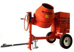 The Crown C9C-GH8 is a nine-cubic-foot towable concrete mixer that comes standard with an eight horsepower Honda GX240 engine. An electric motor is optional on this model. Its steel drum is manufactured using high abrasion-resistant 10-gauge steel, giving it a longer life. It has an oversized dump wheel for easy handling and better control of the drum. Its drive pinions and gear rings are made with cast iron, providing better