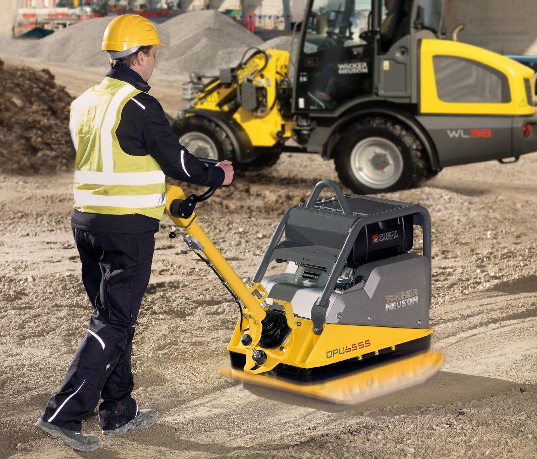 down to see the highly visible LEDs. The LEDs brightness will automatically adjust to the brightness of the environment so that even in bright sunlight the system is easy to read. Unlike other compaction monitoring systems, Wacker Neuson’s Compatec device is positioned entirely in the upper mass of the plate where it is exposed to fewer strong vibrations produced by this powerful plate. This design provides high durability with no wires going between the upper and lower mass of the plate. There is only one short wire between the transmitter and the display. Because of the overload protection system indicated by the flashing lights, there is less chance of damage due to operation on hard surfaces. Wacker Neuson’s Compatec is available on the DPU 6555Hec. This unit weighs in at 1,064 pounds and produces 14,612 pounds of centrifugal force. The low profile unit features standard extension plates providing for adjustable operating widths of either 22 or 28 inches. This popular reversible diesel (12.9 horsepower Hatz) plate offers infinitely variable forward and reverse operation including spot compaction for excellent results on various types of soil.
