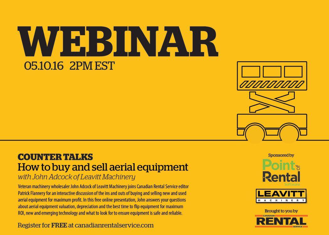 Join Canadian Rental Service editor, Patrick Flannery, and John Adcock of Leavitt Machinery for this online discussion of best practices for buying and selling aerial equipment for rental fleets. Registration is free, and attendees will be able to submit questions for the presenter. Sponsored by Point of Rental software.