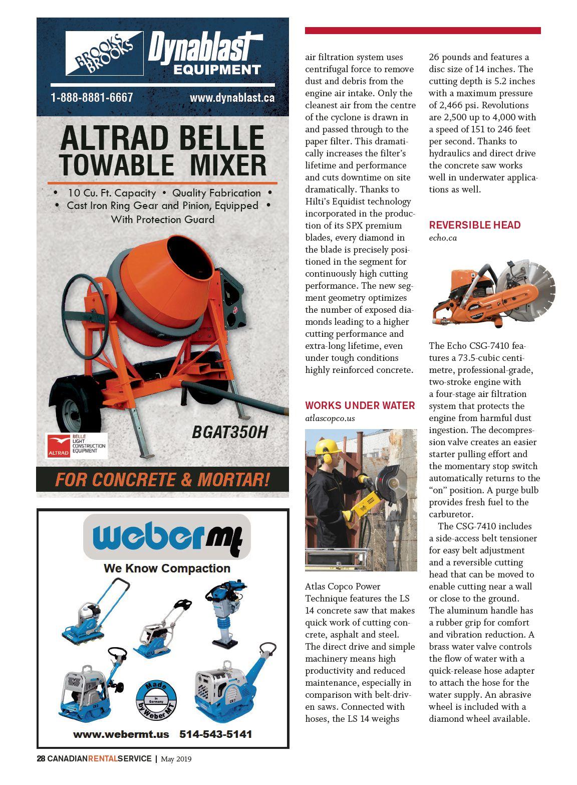 APT’s lightweight, compact MHS 14 cut-off saw packs enough raw power to cut through concrete, asphalt and steel. With its open cutting-face design, the MHS 14 cut-off saw is easy to use, even in demanding conditions. Compared to belt-driven saws, the MHS 14 has a simple, direct-driven configuration for low maintenance. The weight of the MHS 14 is 26 pounds and features a disc size of 14 inches. The cutting depth is five inches with a maximum pressure of 2,500 psi. Revolutions are 2,500 up to 4,000 with a speed of 151 to 246 feet per second. A water kit is available to provide a supply of cooling water where needed. HIGH POWER-TOWEIGHT husqvarna.com