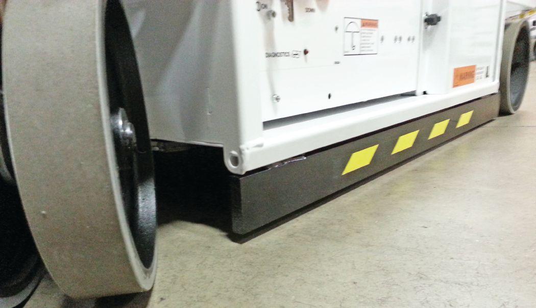 stop the machine from moving and it will just sit on the bars between the front and rear wheels.” Passive systems use a bar that stays in place at all times, rather than moving into position only when the platform goes up. These systems are less expensive, but the bars can get in the way around job sites and when loading the scissor lift on to a flatbed.