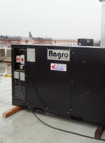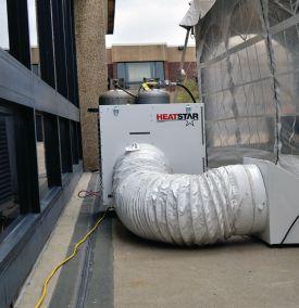 Today’s heaters come with a number of safety features that represent a vast improvement over older designs. This unit from Flagro produces 200,000 BTUs per hour and is thermostatically controlled with a 2,600 CFM recirculating fanshown here with Hitex ducting.