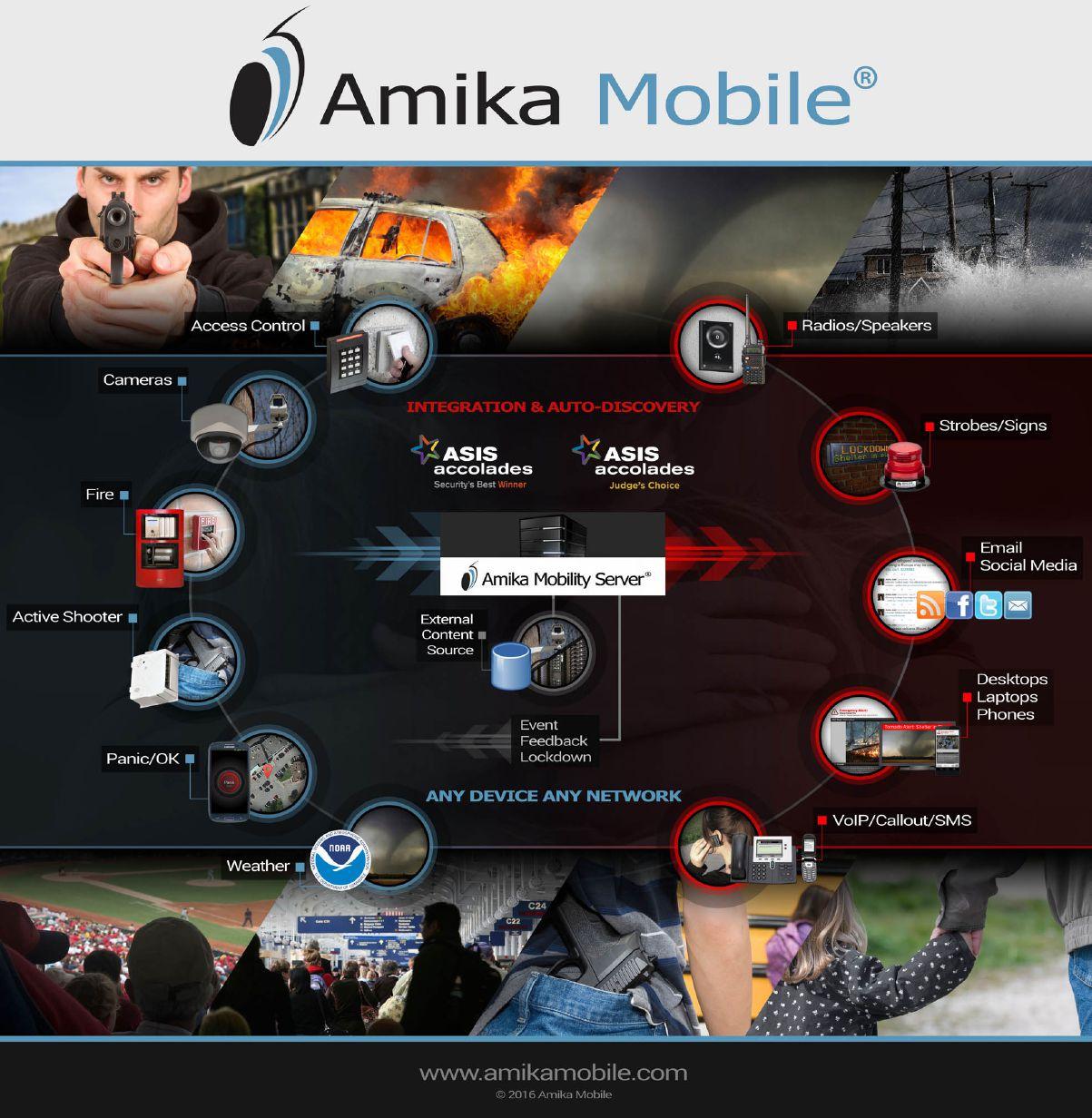 When emergency strikes, be it an airport fire, a hurricane, mass shooting, toxic chemical spill or a power blackout, it is essential that situational awareness, communications and control with affected parties be established as quickly as possible. Amika Mobile has developed the world’s first integrated emergency critical communication and control solution that addresses enterprise security for the Internet of Things (IoT) and automatically discovers recipients and targets alerts to their location. Amika Mobile® Corporation is privately held specializing in critical and emergency communication and control. Its flagship product, the Amika® Mobility Server (AMS), addresses IoT and BYOD security and is ideal for alert/ response in enterprise, community, airport, sports arena, shopping center and campus where visitors may not always be pre-registered in a contacts database since the AMS can auto-discover mobile devices for emergency alert/response. AMS supports 2-way communications and seamlessly integrates with physical systems to trigger event actions such as lockdowns just-in-time®. AMS is a software platform for on-premise, cloud or hybrid operations, fully scalable for both small and large deployments up to millions of users. AMS captures, disambiguates and manages dispa-