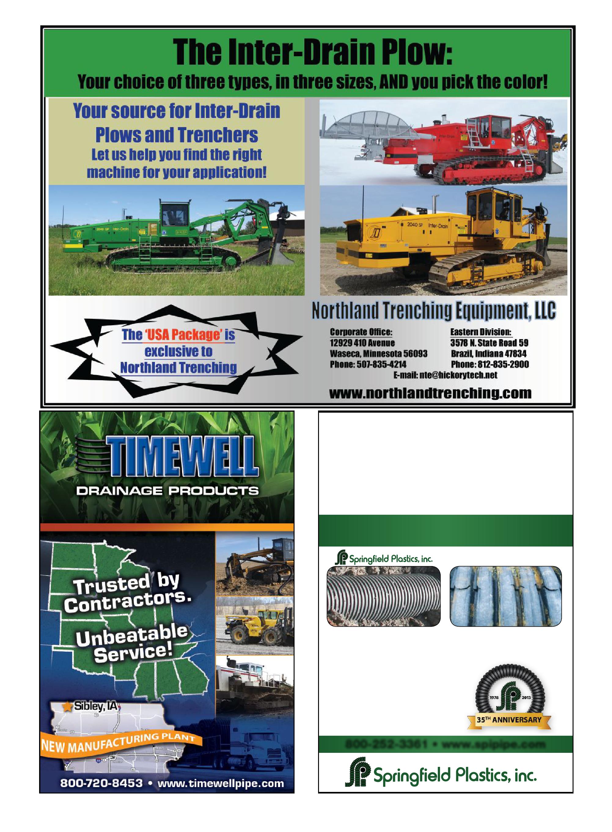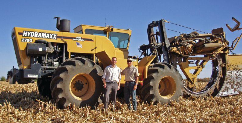 four-wheel drive tractor. “We then went to mounting Zor plows on D-8 Caterpillar crawlers,” Dan remembers. “Since 2002, we’ve used self-contained drainage plows made by Interdrain and Bron.” The self-contained plows they now employ incorporate the use of GPS technology, which Dan says allows for precise, accurate and efficient grade control of tile installation. “The yield monitors for crops that farmers use today also guide us in identifying issues and pinpointing trouble areas on farms,” he says. “All this improved technology enables us to design drainage systems to custom fit each farmer’s needs and provide specific mapping for future reference.”