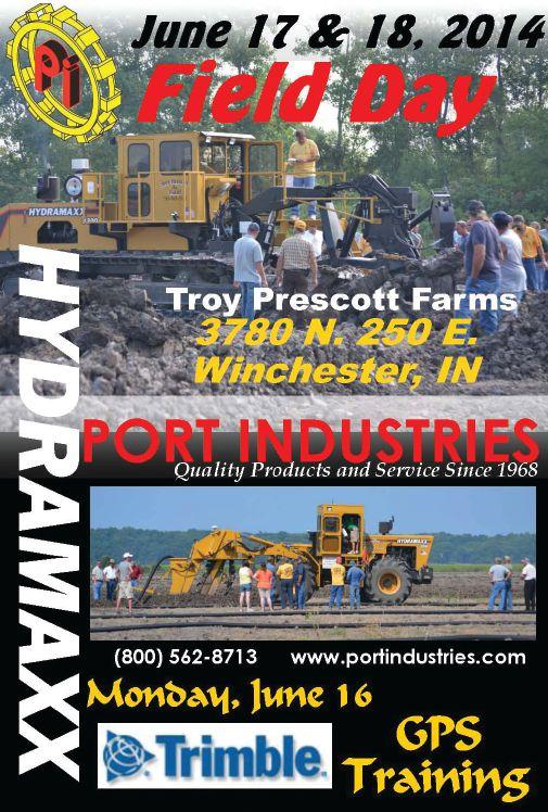 Port Industries and Prescott Farms will host a field day and GPS class in June 2014 in Winchester, IN. A Trimble GPS training class will take place on Monday, June 16, and the Hydramaxx ag drainage field days will follow on Tuesday, June 17 and Wednesday, June 18.