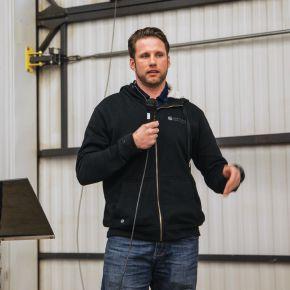 Attendees gathered in the A&E shop for a presentation from guest speakers who addressed issues affecting the agricultural drainage industry. Speakers included Bob Manske, Ed Veeke (owner and president of Wolfe), Kent Rodelius (vice-president of Prinsco, Inc.) and Brian Hicks (farmer and ag consultant), who both represented the Agricultural Drainage Management Coalition, and Phil Algreen of Agri Drain. The speakers discussed drainage water management practices and how tiling has become the new target of water quality issues. Brady Kolbet of Mid-Tech GPS Consulting advised drainage contractors in the audience to use cloud technology to back up tile plotting maps.