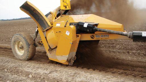 table, we have to rely on evapotranspiration,” Leon explains. Their only other alternative is to grade surface ditches at the same slope most contractors would install a tile drain or lateral. But even the most experienced struggled to maintain margins of error less than a tenth of a foot, grading surface ditches with whatever machine might be available. In years past, farmers have used spade and shovel, mold board plow, and tractor-mounted blades, box scrapers, or small rotary ditchers. On the Wendte family farm, this meant approximately 500 acres remained improperly drained. So Wendte looked to precision implements for improvement. Equipped with a Wolverine rotary ditcher and laser controlled hydraulics, Wendte has installed three- to six-inch deep, five-foot wide, flat-bottomed, surface ditches on over 300 acres