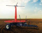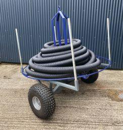 The Easi-Reel attaches to the back of ag vehicles. Its design allows users to load the coil upright, then lay it down on a flexible turntable that allows the tile to be continuously fed through as the vehicle moves along.