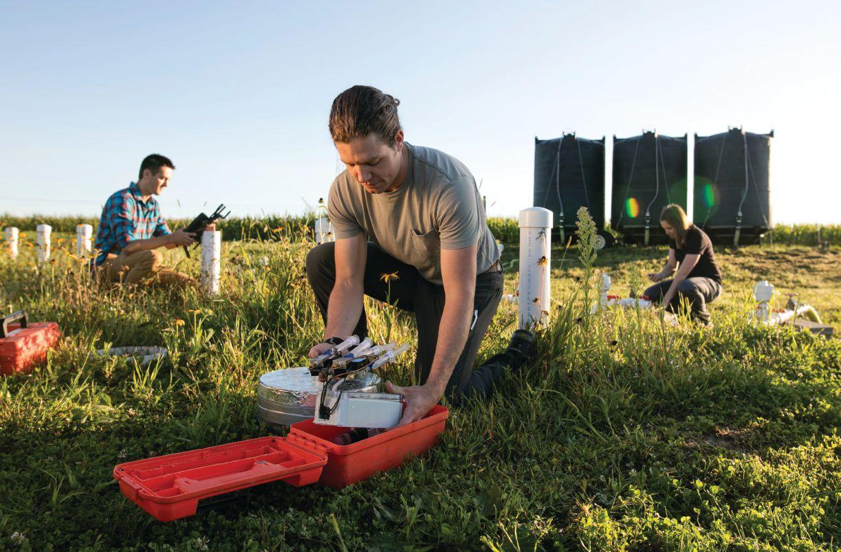 LEFT: A research team from Iowa State University examines a site of mini-bioreactors near Ames, where different woodchip-corncob mixes are being studied.