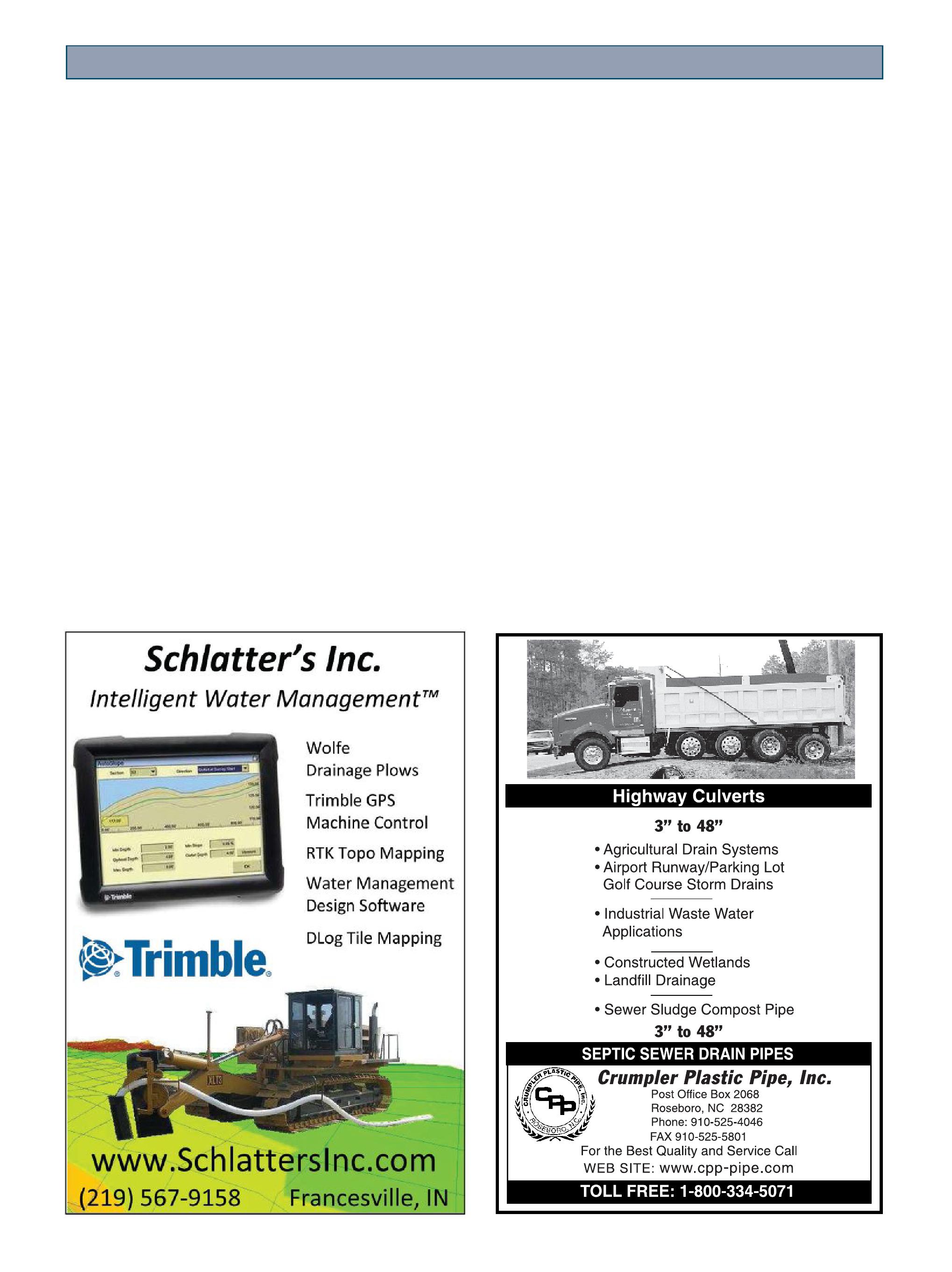 “The main question farmers ask,” according to PPI’s Radoszewski, “is ‘Will a tile drainage system using corrugated HDPE pipe help my crop?’ The answer is an emphatic ‘yes.’ It’s a proven fact that crop yields are improved. The next question is ‘Will adding drainage management tools and the bioreactor help the environment?’ Again, the answer is ‘yes.’” ■