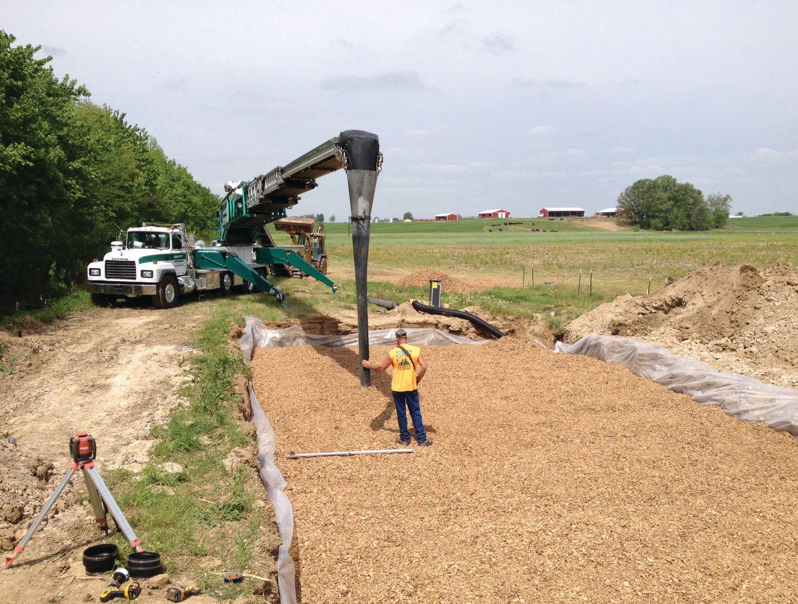 Hay explained that once in the bioreactor, water will flow through a bed of woodchips first and then a steel-loaded barrel before entering the last control structure. An underground bioreactor in the neighborhood of 15 to 20 feet wide and 100 to 120 feet long can handle the runoff from a 30to 40-acre field.