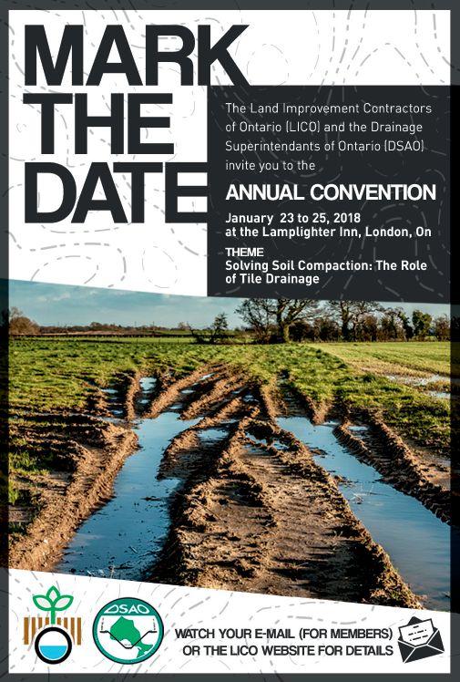 DON’T MISS THE 60TH ANNUAL LICO CONVENTION, TAKING PLACE JANUARY 22-25, 2018 IN LONDON, ONT. PLUS the 2018 Contractor Courses have been announced. Sign up today at https://bdc.ridgetownc.com: Primary Drainage Course, Jan 8-12 Advanced Drainage Course, Feb 5-15 Agricultural Erosion Control Structures Course, Feb 26-Mar 2