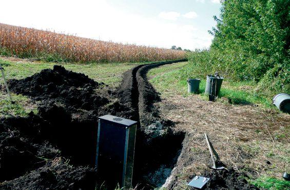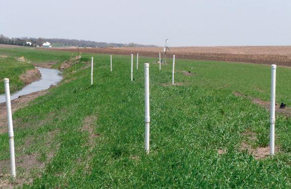 In conducting research on saturated buffers, several monitoring wells are installed (front) between the underground distribution pipe (as indicated by the control box in the background here) and the water leaving the buffer (left).