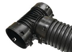 molded HDPE, that lays flat, then snaps together over the pipe like a clamshell. Integrated fasteners and internal tabs ensure a secure connection to corrugated plastic pipe. Snap the EZTee together and push the pipe through, or simply lay the tee under the pipe and snap together. EZTee’s stackable design saves space and shipping costs vs. standard bagged tees! EZTees comply with ASTM F 405-13 & AASHTO M 252-09 standards.