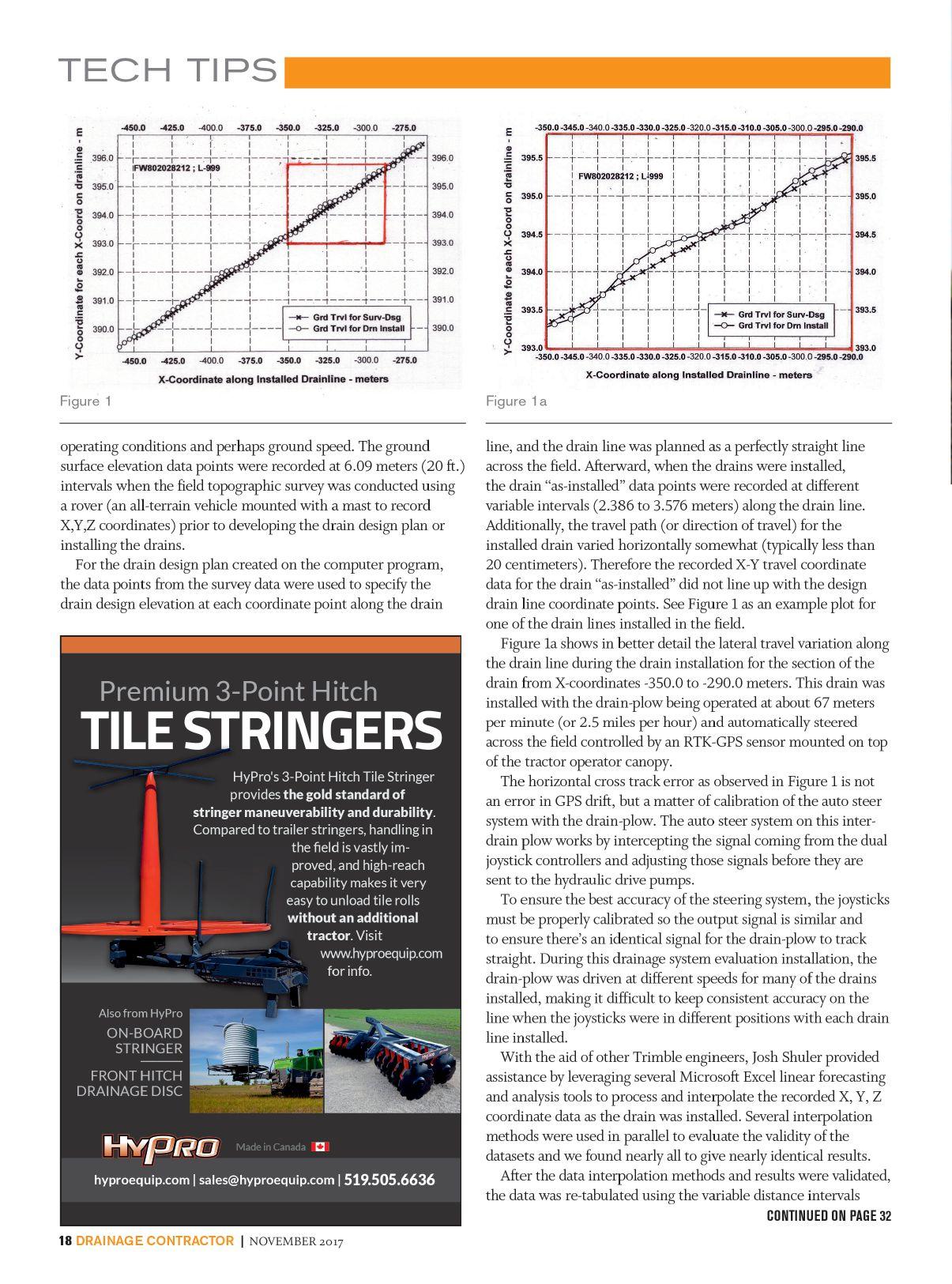 We recommend this type of field evaluation of drain installation quality be conducted for other drain-plow models, and giving attention to ground travel speeds and different linkage systems for the attached pipe-feeder “boot.” Further, we recommend publication of the installation accuracy evaluation results by the plow manufacturer or the contractor. DC