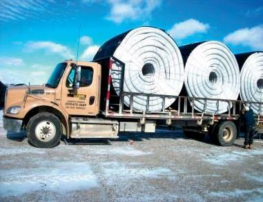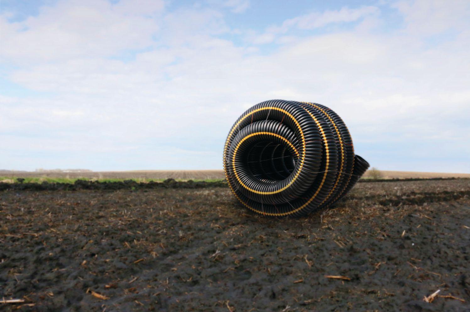 dual-wall sticks with the installation ease of single-wall coils. The dual-wall pipe is designed for high performance drainage mains and installs up to 60 percent faster than traditional sticks. It comes in coils up to 290 feet and can be plowed in using a customized plow boot. This eliminates the need to trench, place and join dual-wall sticks, making installation much safer, faster and more cost effective. The benefit to farmers is less soil compaction, shorter installation timelines and a faster entry into the fields. The ability to plow in mains also makes GOLDFLEX ideal for high water table areas where trenching isn’t possible.
